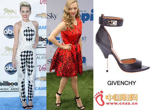 Miley Cyrus 穿着Givenchy绑带凉鞋参加2013音乐奖红毯。这种风格的鞋子首次亮相于2012秋季采用带有黑色皮革设计。她的衣服全身编织了水晶点缀,印有黑白方格,深红色嘴唇装饰与钻石镶嵌的手环也成为了一大亮点。Amanda Seyfried 穿Givenchy的这款凉鞋参加她的新电影首映。她还穿着红色豹纹无袖连衣裙,魅力卷发和黑色钻石耳钉十分完美。