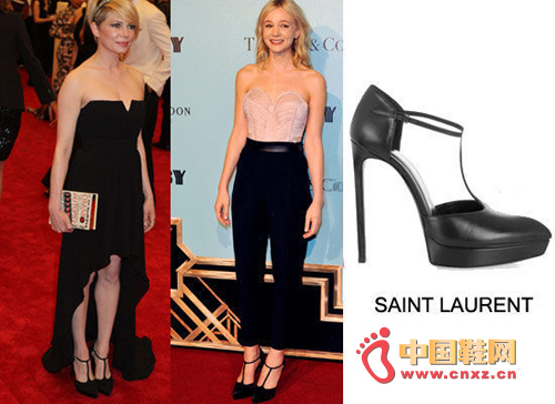 Michelle Williams 穿Saint Laurent 高跟鞋参加2013纽约大都会。这款黑色高跟鞋是来自2013年春夏系列,拥有光滑的黑色皮革、纤细的肩带。还有粉红色可供选择。Michelle看上去十分干练,尤其手里还拿着“宝书”。Carey Mulligan 穿Saint Laurent 丁字鞋高跟鞋参加“了不起的盖茨比”悉尼首映。这款鞋采用光滑的黑色皮革,细带。carey的花边紧身胸衣与领口看起来时尚又性感。上半身是美丽的,但是下半身更适合搭配裙装。铂金色的头发分开,看起来俏皮可爱。