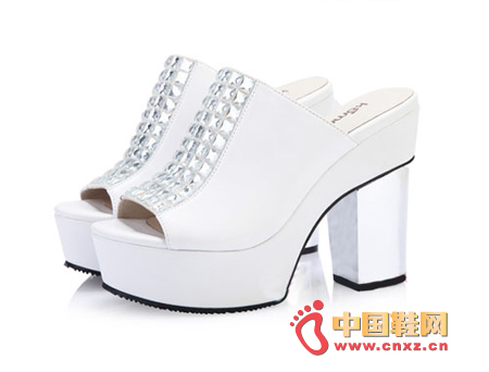 此鞋款精选牛皮材质,大颗水钻排排镶嵌,奢华耀眼气质。电镀粗跟个性时尚,强势气场重磅出击,2013这个夏季必抢的绝对单品!