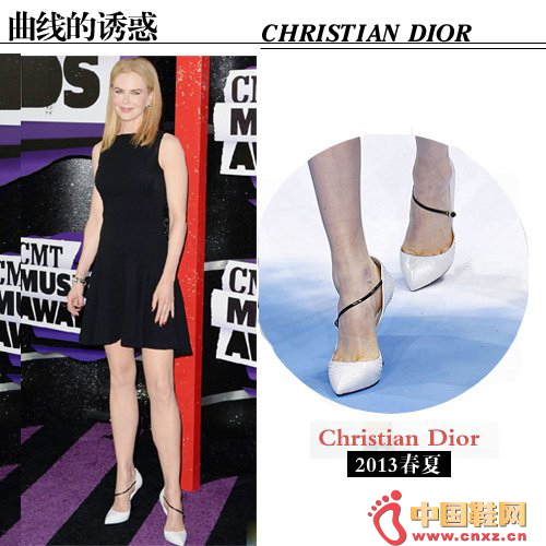 自Raf simons执掌Christian Dior,优雅与精致成为他的设计关键词,不管是他融合古典与现代的极简风时装,与之匹配的高跟鞋同样以优雅与性感的基调贯穿了自2012春夏以来的数场秀场,其中最具代表性的就是那些在脚踝和脚背上附以细细绑带的尖头高跟鞋,或金属或皮革、或粗或细,模特穿着膝上连身裙,脚踩尖尖的高跟鞋,脚背上的那条斜斜的线宛如女人的妩媚曲线,性感而极具现代格调。