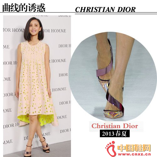 在Dior homme的活动上,张歆艺在鱼嘴凉鞋的脚背上附加了一条粉红色金属绑带,微微泛光的绑带让普通的凉鞋赢来不同凡响的摩登效果。