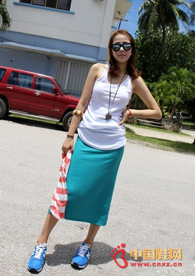 蓝色运动鞋搭配白色背心和半身裙