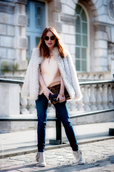 天气已冷,一双中跟踝靴绝对是通勤、上班着装的必需。纯色的流苏鞋子搭配皮草上衣,让简单的造型颇有BOHO范儿。将简洁、优雅、俏皮完美结合,展现出更多的诱人魅力。