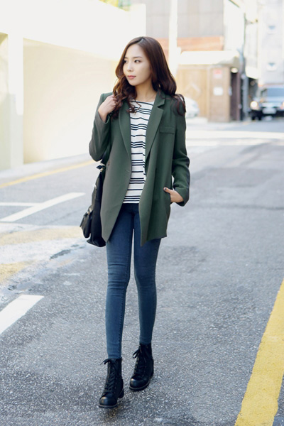 短靴搭配上紧身牛仔裤,很常见的秋季搭配,让MM们双腿很显修长呢,而且很显高挑呢,蓝白色的条纹打底衫搭配上绿色的西装外套,简约好看,而且是很流行的秋装搭配呢!
