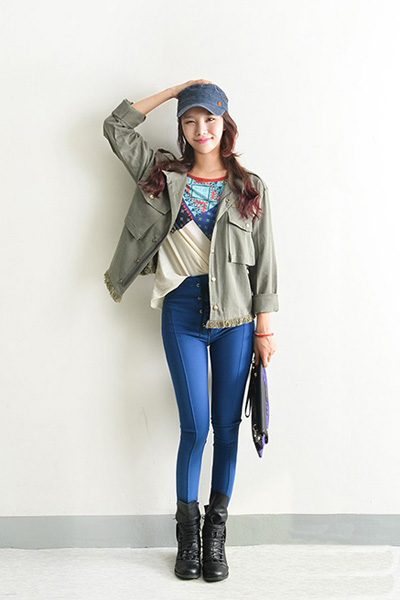 这样一身休闲风格的搭配很是养眼好看呢,浅绿色的工装外套,短款的设计搭配上黑色的短靴让MM们穿出九头身来呢,印花的白色T恤搭配适合上高腰的紧身牛仔裤,显瘦而很小清新呢!