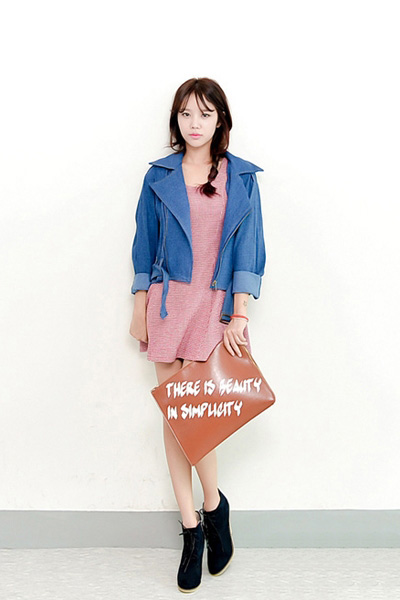 外套搭配上连衣裙很常见的秋装搭配呢,这样简约风格的搭配一样小清新养眼呢,粉色的背心连衣裙外搭上短款的牛仔外套和短靴,显瘦又很显高挑的气质美搭呢!