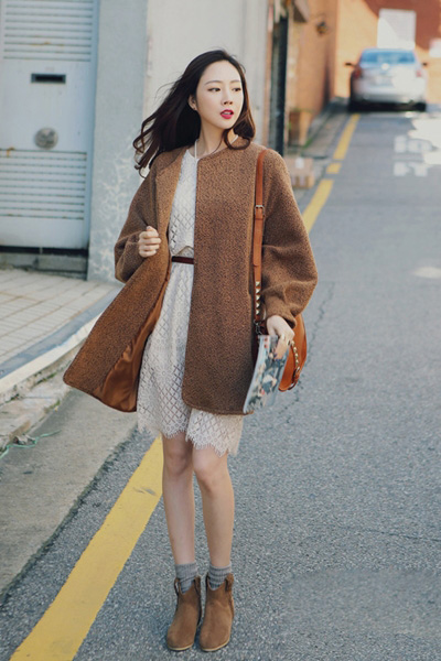 这款薄呢子外套很适合秋季呢,时尚而且保暖呢,宽松的外套款式不挑MM们的身材呢,白色的蕾丝连衣裙搭配上短靴,这样一身风格的搭配让MM们看起来时髦好看呢!简简单单能穿出女神气质呢!
