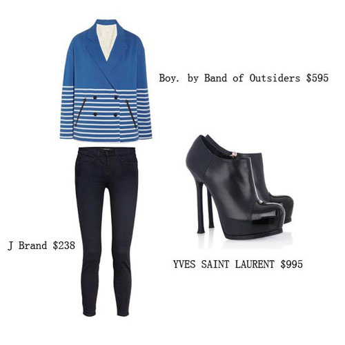 黑色的紧腿裤配上黑色的细高跟短靴可以拉长腿部的线条,让双腿显的更加秀场。黑色漆皮拼接的鞋头为下身黑色的沉闷感增添了一丝时尚气息。条纹衫的西装外套休闲之中带着点正装的感觉。