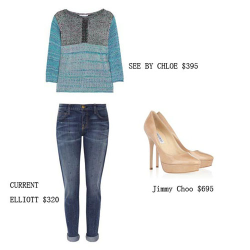 卷边的蓝色瘦腿裤印染的花纹增添了一丝时尚感,蓝色拼接的毛衣看似不起眼可穿起来绝对有型。裸色的尖头高跟鞋低调之中带着一丝性感味道。