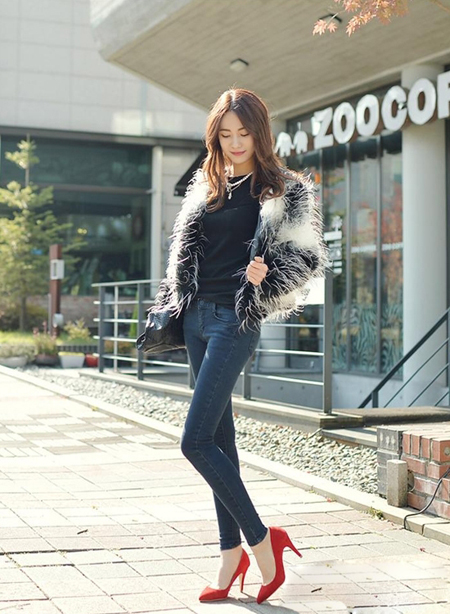 毛毛外套+修身小脚裤+红色尖头高跟鞋