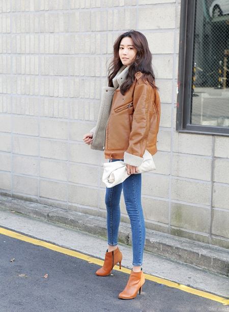 棕色皮夹克+修身小脚裤+高跟踝靴