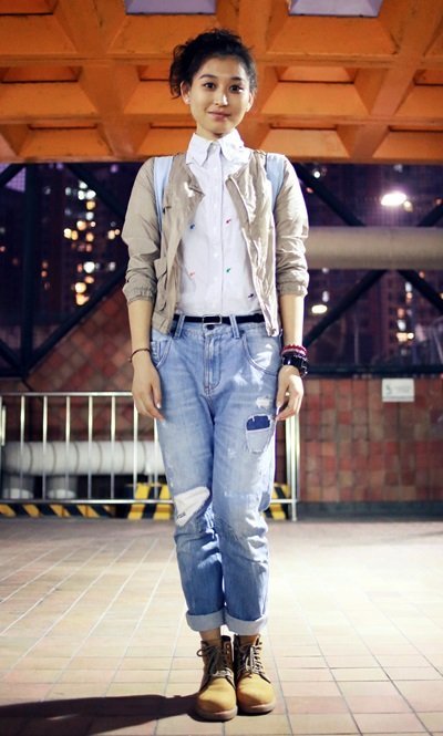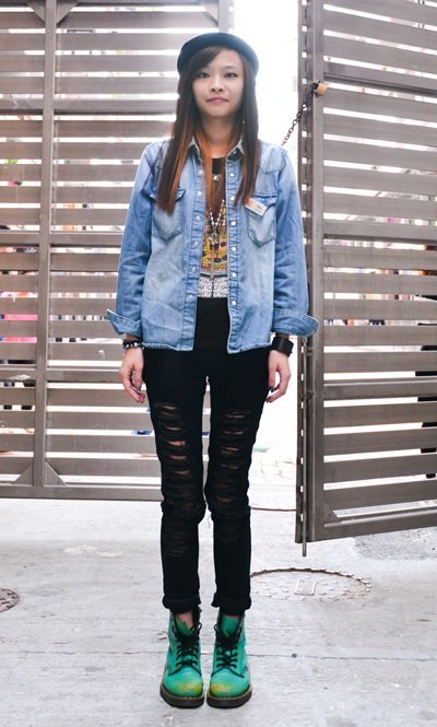 枣红色绝对是英伦复古的代表色,8孔的马丁刚刚好展示出你小腿最美丽的部分,搭配旧旧的牛仔上衣刚刚好,这样的枣红色有没有很正!(合作媒体:服装搭配)