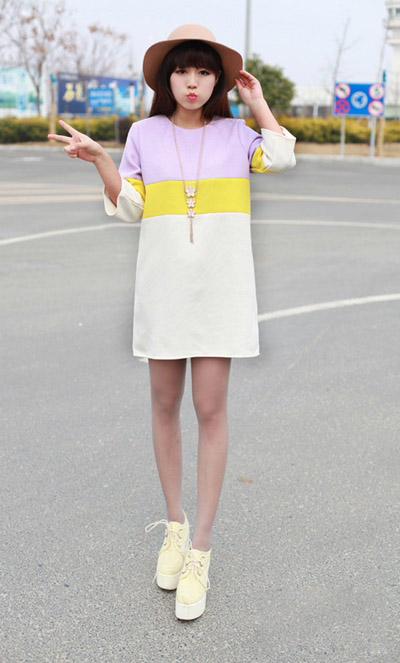 示范搭配:紫色黄色白色拼接连衣裙搭配白色厚底鞋,甜美又淑女的搭配风格。
