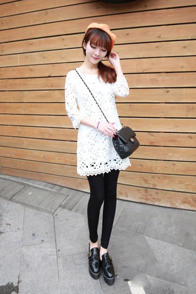 示范搭配:白色蕾丝连衣裙搭配黑丝打底裤,在加上黑色厚底鞋, 柔美的淑女风格跟中性风的皮鞋一点也不违和。