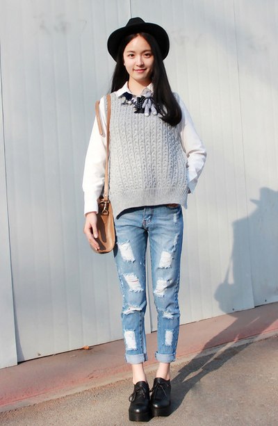 示范搭配:灰色毛衣背心搭配白衬衣,非常简约又气质的搭配, 搭配破洞牛仔裤和黑色皮鞋,增高不是一点点哦。