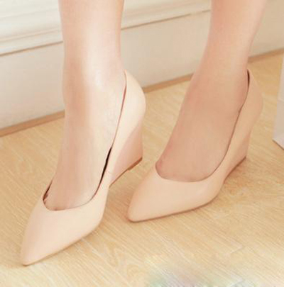 这款裸色坡跟鞋,没有很高设计,浅口的款式更显知性魅力,渐渐圆头的风格很有小清新的魅力,在春季服饰搭配上,轻松凸显出淑女范的味道,升温季节时穿最好合适不过了。