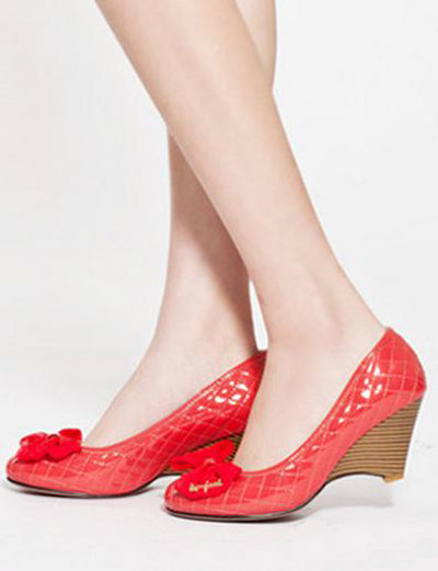 这款红色坡跟鞋,浅口设计加上亮丽的色彩让整个人瞬间变得很抢眼,蝴蝶结的设计有一种非常甜美小女人的气息,一些切割格纹设计,仿照了时尚韩版的风格,更显时尚魅力。(合作媒体:服装搭配)
