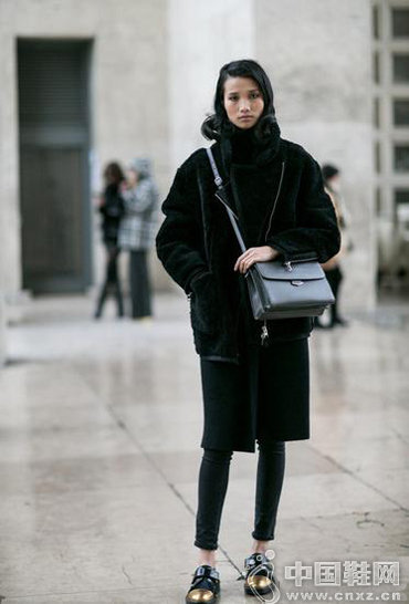 时尚博主Zina Charkoplia身穿黑色皮草外套,戴着黑超,手拿信封包,脚踩布Marni金属装饰布洛克鞋现身时装周秀场外。(中国鞋网-最权威最专业的鞋业资讯中心。合作媒体:宝丽娜女鞋)