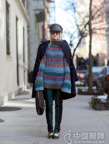 挪威stylemag网站主编Celine Aagaard身穿条纹针织毛衫,下搭绿色黑色拼贴长裤,脚踩Marni金属装饰布洛克鞋现身时装周秀场外。