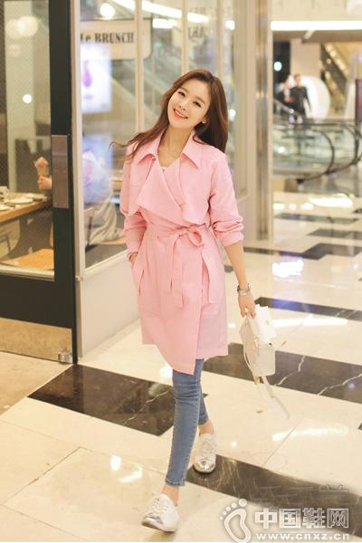 粉红色风衣清新甜美,散发出小女人的迷人气息,款式和色彩都带着浓郁的韩式风格,增添精致感,搭配小脚牛仔裤和白色运动鞋,气质装扮中加入休闲风,打造更年轻的活力造型。