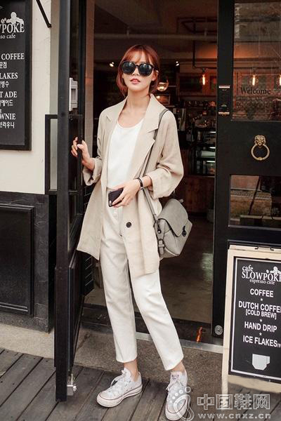 卡其色风衣经典百搭,配白色T恤和白色九分裤,非常清爽大方,脚踩白色帆布鞋舒适休闲,显得很有文艺气质。 (中国鞋网-最权威最专业的鞋业资讯中心。合作媒体:爱丽女鞋)