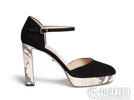 DIANE VON FURSTENBERG 蟒蛇皮鞋跟麂皮高跟鞋,舒适实穿的粗跟鞋,复古的圆头搭配细款踝带,极具温柔气息,而水台及鞋跟外层包裹了野性十足的蟒蛇皮,两种风格结合得恰到好处,不论搭配女人味造型还是随性休闲风格都非常适合。
