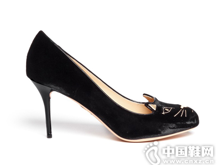 Charlotte Olympia 丝绒猫脸高跟鞋,以猫的五官及耳朵为主题,利用金色线精心缝制,趣味性及可爱度满分,加上黑色丝绒作面料,可搭配充满青春活力的洋装,尽显甜美可人的少女情怀。