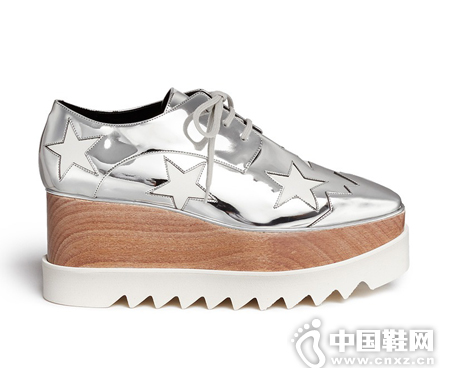 STELLA MCCARTNEY 星星拼贴坡跟系带鞋,此款系带鞋夸张前卫,银色主调配上白色星星拼贴十分抢眼,最大亮点属中层的棕色木制坡跟鞋底,别具独特个性,加上底层的锯齿橡胶鞋底,令双腿看起来更为纤长,潮流先锋绝对不容错过。