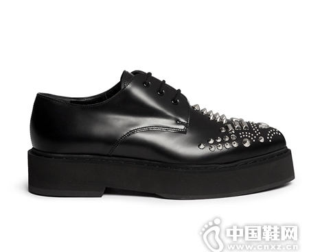 ALEXANDER MCQUEEN 铆钉装饰真皮厚底鞋,黑色亮面真皮表面缀有形状不同的银色铆钉,把品牌的暗黑风格表现得淋漓尽致,穿着舒适同时修饰腿型,让您轻松演绎高级街头时尚。