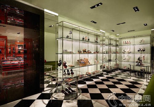 【中国鞋网-街头搜店】意大利高端时装屋 Prada 位于威尼斯的 Piazza San Moisè 门店在经过大规模的整修后近日重新开幕。进入商店,复古威尼斯风格映入眼帘,约 850 平方米跨越两个楼层的内部空间由意大利建筑大师 Roberto Baciocchi 打造。一楼设有女用包款、配饰及鞋类等,男装系列则分布在桑格大理石圆柱房间内。与此同时,楼上是女士成衣系列,与一个舒适的 VIP 展示房。采用黑白色的大理石地板和绿色环保面料覆盖的墙壁,与皮质展示柜与绿色天鹅绒沙发互相搭配。男装区域则以薄面 Saint Laurent 大理石地板与橘色墙面展示皮具以及鞋款显示更多男性气息,成衣系列则展示在一个鸵鸟皮沙发加载黑檀木墙面与地板的房间内。