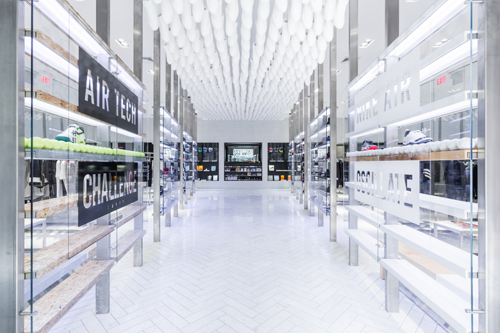 店铺主要以极简主义的白色为主调,其中布满白色 Air Jordan II 的天花板让人过目不忘,而地上则铺满了特别定制的 Carrera 人字纹大理石地砖, 搭配上不锈钢支架,以及随处可见的玻璃和镜子,营造出一个华丽而又现代的购物空间。店内除了 KITH 自家服饰支线外,还将带来 Fear of God 和 Y-3 等精选品牌的最新单品,而 KITH Archive 专区记录了近年来 Ronnie Fieg 最具代表性的联名球鞋设计。