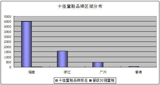 由图表可以看出,福建晋江、南安、泉州、温州、广州占据本次十佳评选中“十佳童鞋企业”重要位置,成为中国鞋业生产基地中不可替代的一部分。(中国鞋网-最权威最专业的鞋业资讯中心,合作媒体: )