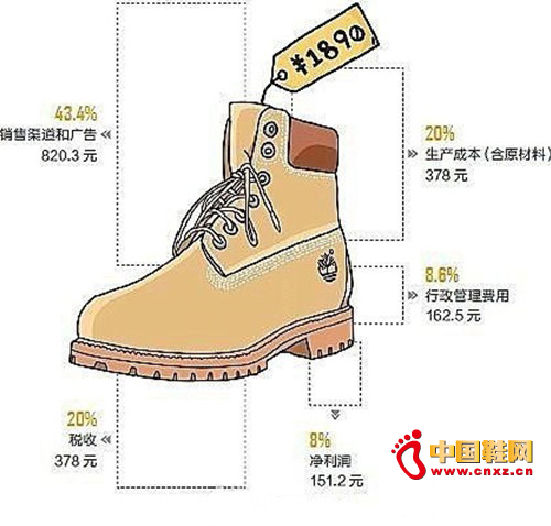 【中国鞋网-品牌观察】一双标价1890元人民币的户外鞋为例,其生产成本(含原材料)378元(占20%),行政管理费用163.5元(占8.6%);销售渠道和广告820.3元(占43.4%);税收378元(占20%);净利润151.2元(占8%)。