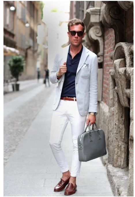 在夏天用来搭配短裤或九分裤或是休闲西装无论在哪里都会是优雅的焦点。白裤子、灰裤子、深蓝、深棕、卡其、蓝色牛仔裤是最佳搭配。