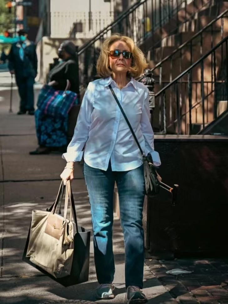 如果中老年人的鞋柜里有一双平底球鞋,却不知道该搭配什么下装,那么推荐你选择蓝色牛仔长裤,借助两种风格趋同的日常单品,让造型更随性自在。