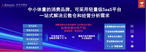 对于海量中腰部品牌或者代运营企业而言,公司体量较小、收入较低,没有足够的团队和成本构建大数据平台,如何快速满足数仓和经营分析需求?谭李在演讲中表明,数势科技打造了一款足够轻量的SaaS产品——电商经营分析产品(数势经营罗盘),目前已上线京东云,能够一站式解决企业全渠道经营数据接入和经营分析的需求,开箱即用,万元成本。