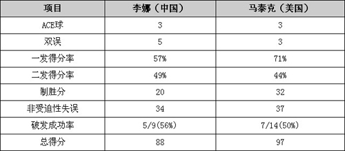 全场比赛李娜轰出3个ACE球但是出现了5次双误,而对手3个ACE球3个双误。一发得分率李娜要低于对手,尤其是后两盘比赛表现得非常明显;制胜分方面李娜比对手少了12个,马泰克的搏杀非常见效,虽然非受迫性失误李娜比对手也少了3个,但是这一环节没有影响到大局。 李娜今日一共完成了5次破发,而对手则高效的7次破发得手。