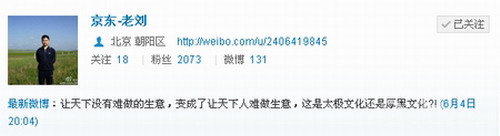 【中国鞋网-鞋业趋势】6月5日消息 刘强东沉不住气了。4日晚间8点,刘强东通过未经认证的“东-老刘”微博发出了一条微博,称“让天下没有难做的生意,变成了让天下人难做生意,这是太极文化还是厚黑文化?!”,内容直指向来推崇太极文化的阿里集团。