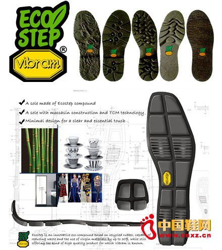 VIBRAM?在1994年推出VIBRAM? EcoStep配方,在这个方向迈出了。VIBRAM?已经成为使用环保/再生材料的先行者。VIBRAM? ECOSTEP包括至少30%再生橡胶,VIBRAM? ECOSTEP+中的再生橡胶成份达到50%。两种产品都保持了与现有VIBRAM?产品相同的质量水平。VIBRAM?在随后几年将其环保努力延伸到EVA产品。现在, EVA中底Flash的10%是再生EVA。 VIBRAM?正在着力使用全天然(可再生和无油)配方、可生物降解TPU和橡胶合成配方以及可再生的PU和TPU产品。 另外,VIBRAM?北美生产站点支持循环政策,并且已经开发出供100%再生橡胶为基础的地板应用的全系列的“绿色”产品。