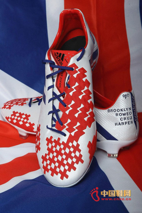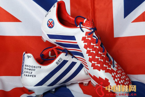 【中国鞋网-时新装备】初见第一眼,相信不少人就会被这双mi adidas充满浓郁英国风情的红白蓝配色迷倒,上面除了有Beckham娇妻Victoria的名字之外,几个孩子的名字也在铭刻在旁边,包括Brooklyn、Romeo、Cruz和可爱的Harper,而且Beckham职业生涯中穿过的球衣数字7, 23和32也在其上,足够个性化,且纪念意义非凡。Beckham从1996年起便担任adidas的代言人,本次adidas奉上这双几乎是独身订製的,Beckham本人自然感触良多:“这对我来说是特别的一刻,我很高兴长期的服务伙伴adidas能和我一起纪念这一刻。”