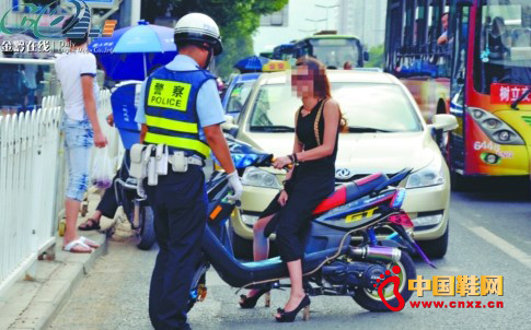 【中国鞋网-滚动快讯】穿着13厘米高的高跟鞋,连走路都不太方便,可一名女子却穿着这么高的鞋驾驶摩托车,而且还是无证驾驶。幸好交警及时发现,并制止其危险的驾驶行为。