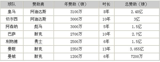 21日出版的英国《太阳报》公开报道称,切尔西与Adidas签署了一份10年总额3亿英镑的赞助大单。平均每年3000万英镑的运动装备赞助进项,令切尔西追平阿森纳,成为在英超联赛中年均运动装备赞助金额最高的球队(同为3000万英镑)。紧随伦敦双雄的是利物浦,红军此项收入为年均2500万英镑;而曼联(2350万英镑)以及曼城 (1200万英镑)则分列英超4、5位。在整个国际足坛,皇马以年均3100万英镑的运动装备赞助进项排名榜首。