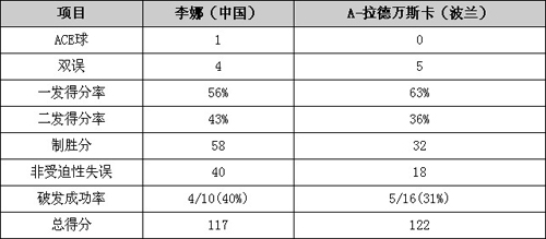 比赛耗时长达2小时43分钟。李娜在ACE球的数量上以1-0领先,双误则以4-5少于对手,一发得分率金花略微落后,但是在双误方面领先对手。李娜今日在进攻方面打出了自己的特点,在制胜分上以58-32领先,但是在非受迫性失误方面也以40-18多于对手。破发方面李娜仅比对手少了1次,最终以非常遗憾的方式输掉了比赛。