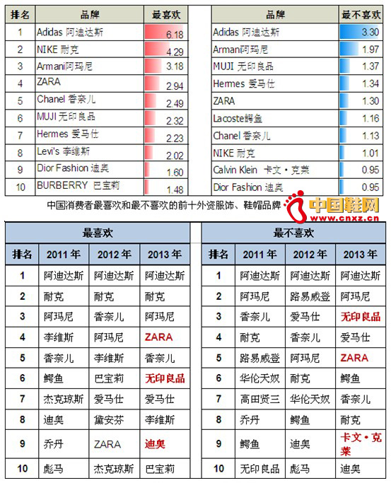 【中国鞋网-品牌动态】2013年度“中国消费者外资品牌好感度调查”近日揭晓,在针对外资服饰、鞋帽品牌的调查中,、和成绩靠前,分列受访者最喜欢的外资品牌前三名,然而有趣的是,在中国消费者最不喜欢的品牌排行中,阿迪达斯同样名列“头名”,成为被消费者最负面评价的品牌,而这种评价极端分化的现象,在阿迪达斯身上竟已延续了三年,三年的调查中,阿迪达斯都令人震惊地夺得了“双头名”。