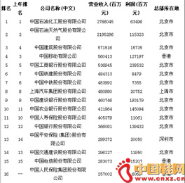 中国500强排行榜是从上市的中国公司中选择经营规模最大的500家公司组成的(包括在上海和深圳证券交易所的上市公司,及海外上市、主营业务在大陆的公司),目的是可以更加全面地反映中国经济。可以说中国500强排行榜是针对上市中国公司的一份盘点榜单,每年发布一次。以下是2013年中国500强榜单排名前15的企业: