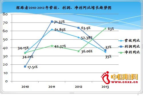 【中国鞋网-品牌观察】随着中国户外行业这几年的快速增长,作为国内第一家在创业板上市的本土户外品牌,的发展一直吸引着业内的关注。从探路者上市以来的业绩增长情况来看,2010年至今的四年间该品牌一直保持了较高的增幅,尤其是在2011年,其营业收入、利润总额和股东净利均达到了60%以上的增长。通过对探路者上市以来的年中财报进行统计,可以看出该品牌的盈利能力和品牌管理能力都在得到持续的提升,虽然行业在2013年出现高中放缓的趋势,但探路者的年中财报预告显示出其营收和利润总额分别达到了35%和37%,实现净利润则高达63%,接近其上市以来的最高水平。