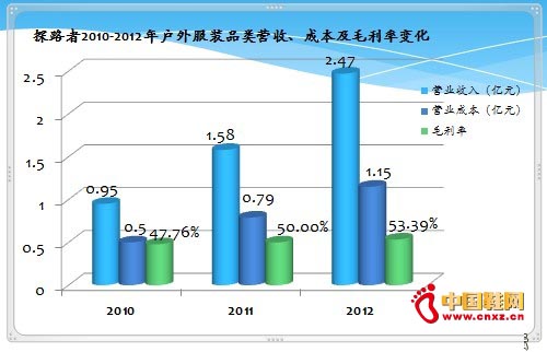 另外,通过对探路者2010年至2012年三年间服装、鞋和装备三个品类的营收状况的对比来看,户外服装在其业绩中占据着约50%-60%的比例,毛利率也超过了50%。和装备的毛利率也都保持在较高的水平,随着该公司进一步强化平台建设和对各类支出预算的管控,企业盈利能力进一步提升的空间仍比较大。(中国鞋网-最权威最专业的鞋业资讯中心,合作媒体:)