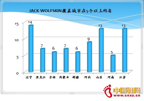从统计结果来看,JACK WOLFSKIN未来对重点城市扩展空间还比较大,在西南市场的拓展力度或许可以加强一些。另外,随着众多品牌商不断加大电商领域的渠道建设,JACK WOLFSKIN的网络旗舰店也已发展到5个,据统计,目前授权的5家网络渠道分别是天猫、京东、亚马逊、银泰和优购网。(中国鞋网-最权威最专业的鞋业资讯中心,合作媒体:)
