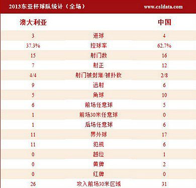 国足在所有进攻数据上都占优,控球率62.7%VS37.3%,16脚射门12次命中目标,而澳大利亚队也有15脚射门,不过只有7脚命中目标。在角球方面,国足10-5也是对手的两倍,攻入前场30米区域的次数达到31次,也高于对手的26次,只是最后阶段的两个丢球极为可惜。