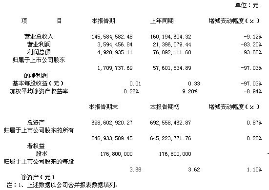 截止2013年6月30日,公司总资产为698,602,920.27元、归属于上市公司股东的所有者权益为646,933,509.45元、每股净资产为3.66元,较上年同期相比分别增长0.87%、0.26%、1.10%,主要原因系经营中的利润积累形成。